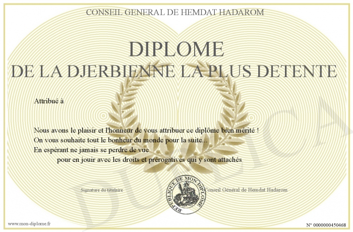 Envoyez par email votre Diplôme de la Djerbienne la plus détente personalisé