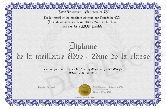 Envoyez par email votre Diplôme de la meilleure élève - 2ème de la classe personalisé