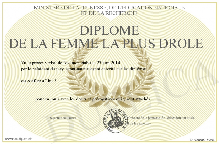Envoyez par email votre Diplôme de la femme la plus drôle personalisé