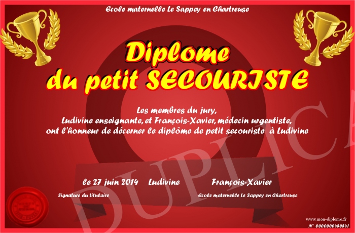 Envoyez par email votre Diplôme du petit SECOURISTE personalisé