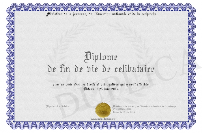 Envoyez par email votre Diplôme de fin de vie de celibataire personalisé