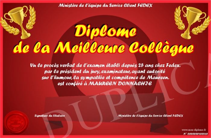 Envoyez par email votre Diplôme de la Meilleure Collègue personalisé