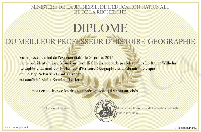 Envoyez par email votre Diplôme du meilleur professeur d'Histoire-Géographie personalisé