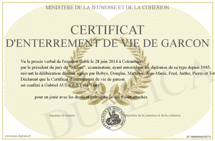 Envoyez par email votre Certificat d'enterrement de vie de garcon personalisé