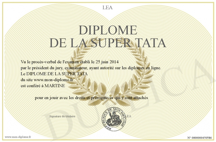 Envoyez par email votre DIPLOME DE LA SUPER TATA personalisé
