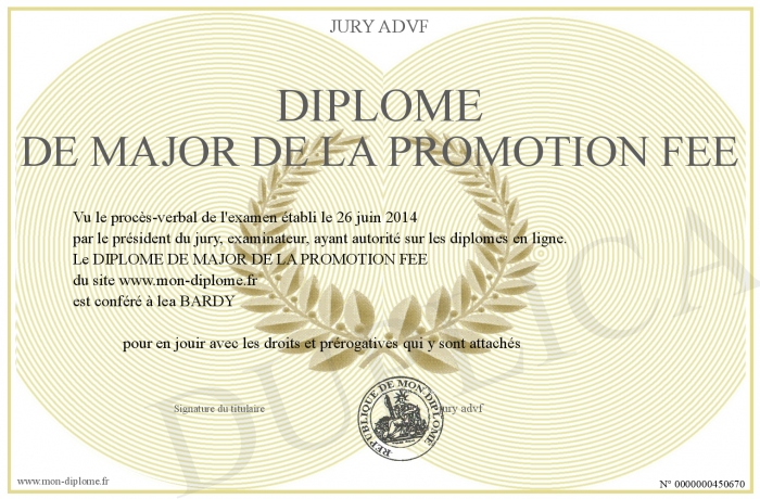Envoyez par email votre DIPLOME DE MAJOR DE LA PROMOTION FEE personalisé