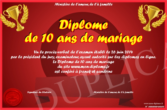 Envoyez par email votre Diplôme de 10 ans de mariage personalisé