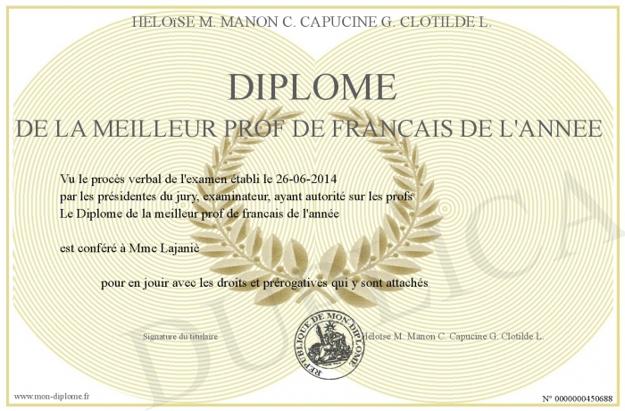Envoyez par email votre Diplôme de la meilleur prof de francais de l'année personalisé