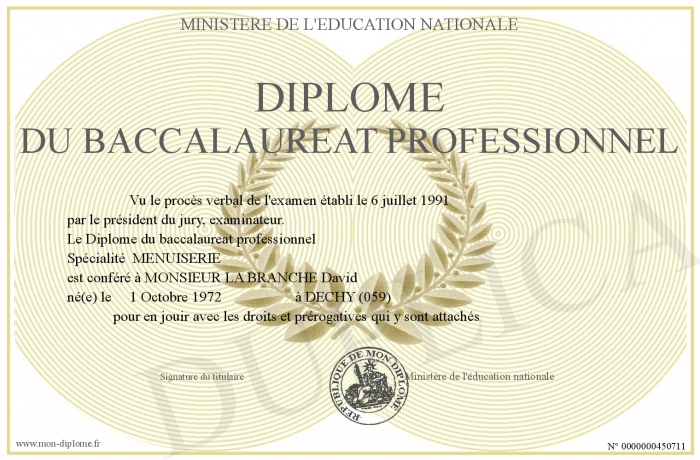 Envoyez par email votre Diplôme du baccalaureat professionnel personalisé