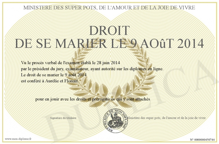 Envoyez par email votre Droit de se marier le 9 août 2014 personalisé