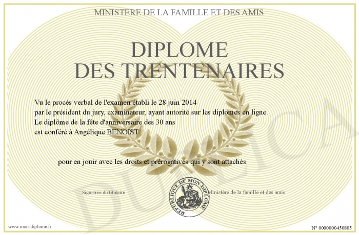 Envoyez par email votre Diplôme des Trentenaires personalisé