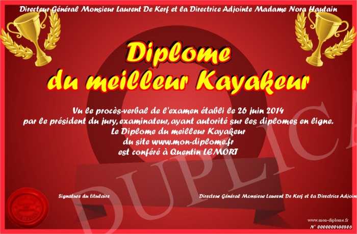 Envoyez par email votre Diplome du meilleur Kayakeur personalisé