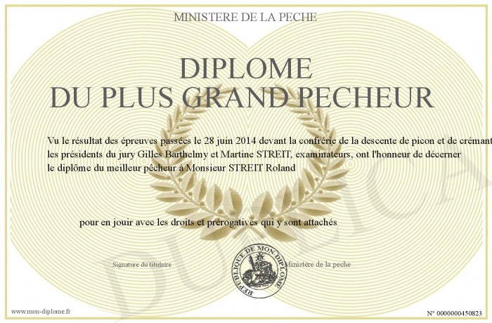 Envoyez par email votre Diplôme du plus grand pecheur personalisé