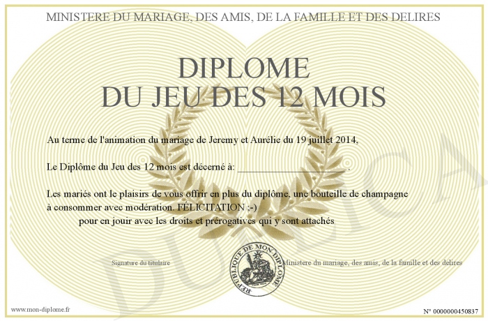 Envoyez par email votre Diplôme du jeu des 12 mois personalisé