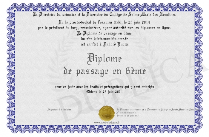 Envoyez par email votre Diplôme de passage en 6ème personalisé