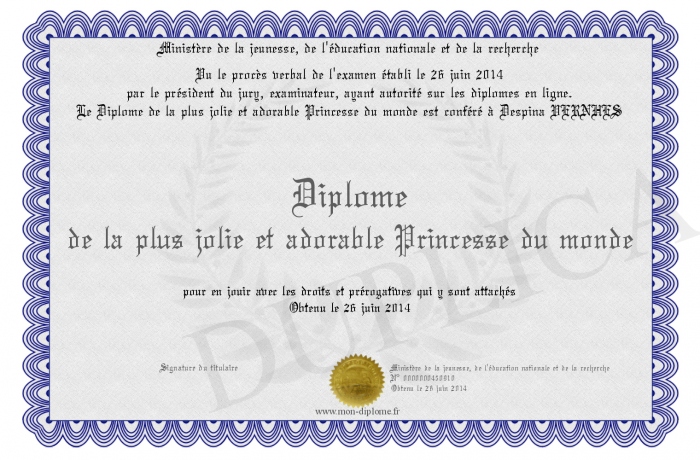 Envoyez par email votre Diplôme de la plus jolie et adorable Princesse du monde personalisé