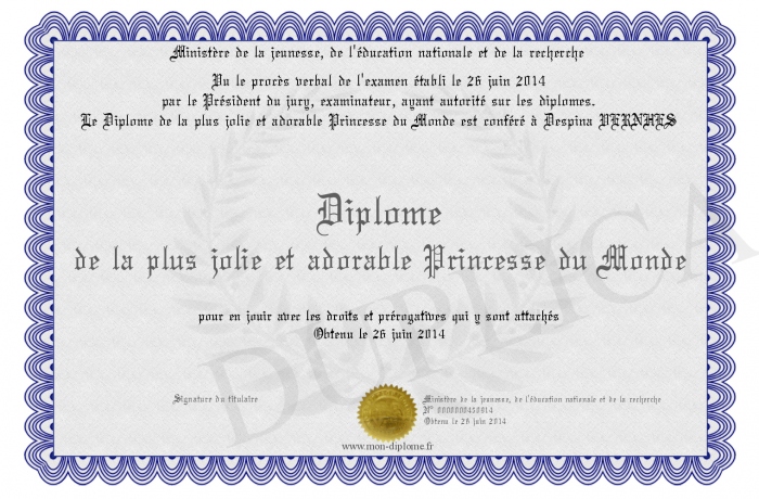 Envoyez par email votre Diplôme de la plus jolie et adorable Princesse du Monde personalisé