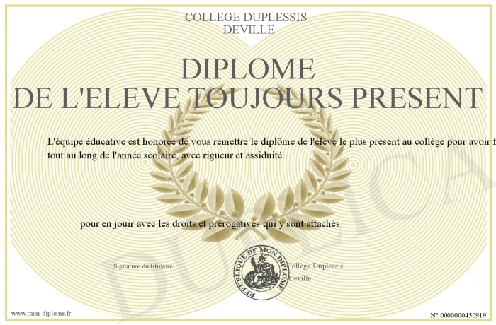 Envoyez par email votre Diplôme de l'élève toujours présent personalisé