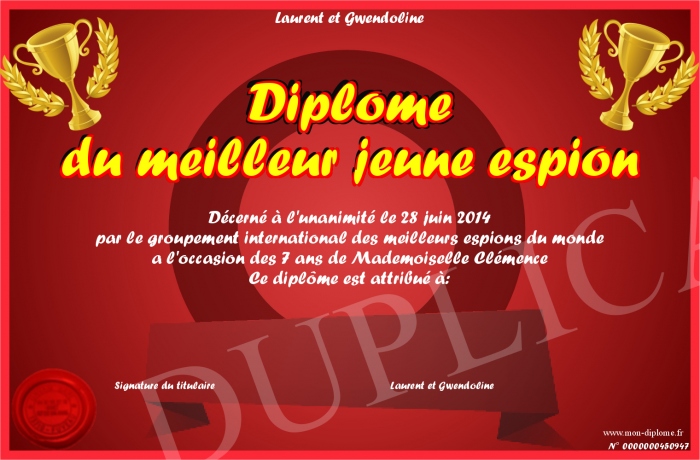 Envoyez par email votre Diplôme du meilleur jeune espion personalisé