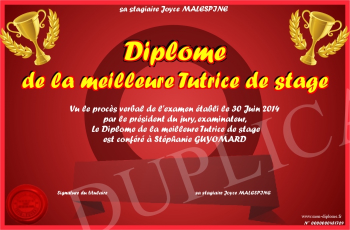 Envoyez par email votre Diplôme de la meilleure Tutrice de stage personalisé