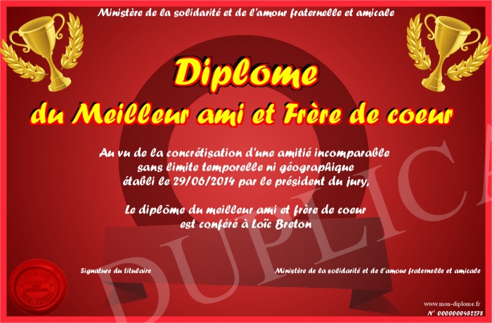 Envoyez par email votre Diplôme du Meilleur ami et Frère de coeur personalisé