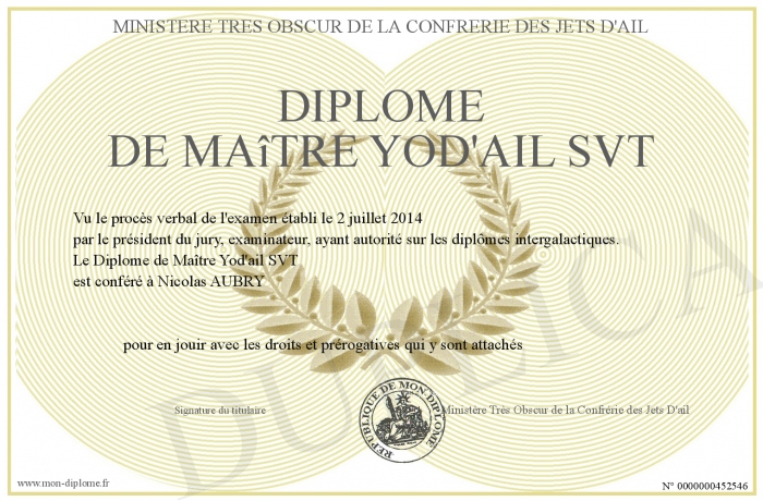 Envoyez par email votre Diplôme de Maître Yod'ail SVT personalisé