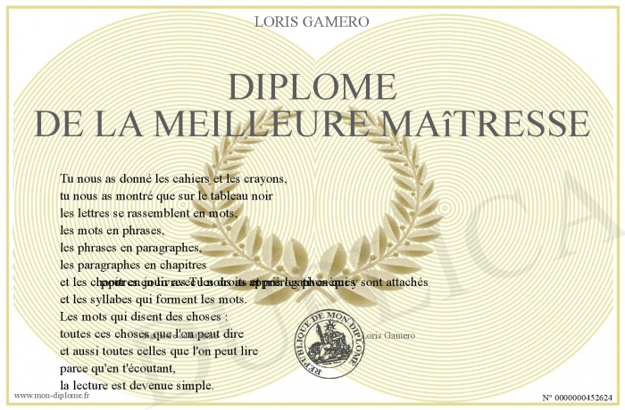 Envoyez par email votre diplome de la meilleure maîtresse personalisé