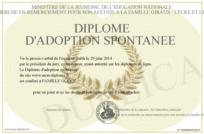 Envoyez par email votre Diplôme d'adoption spontanée personalisé