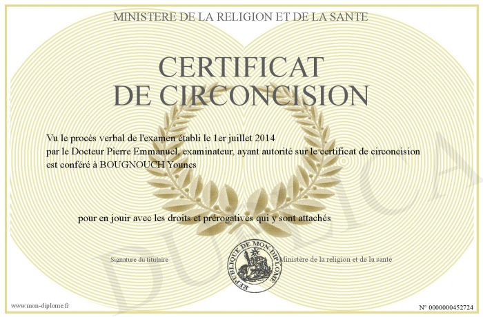 Envoyez par email votre CERTIFICAT DE CIRCONCISION personalisé