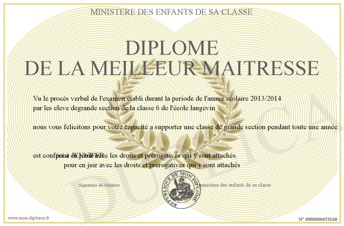 Envoyez par email votre Diplôme de la meilleur maitresse personalisé