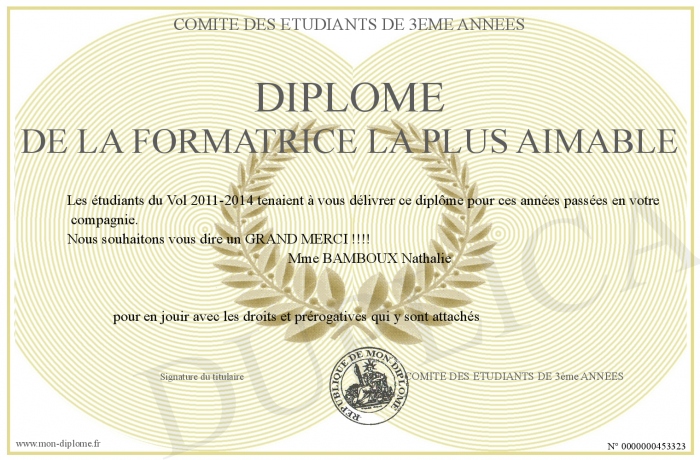 Envoyez par email votre Diplôme de la formatrice la plus AIMABLE personalisé