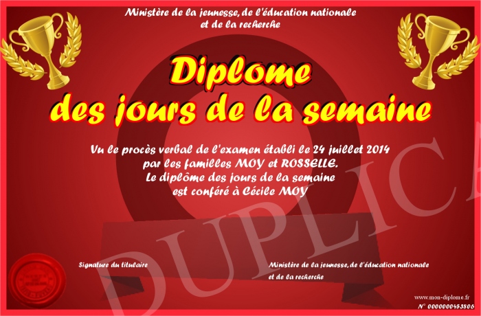 Envoyez par email votre Diplôme des jours de la semaine personalisé