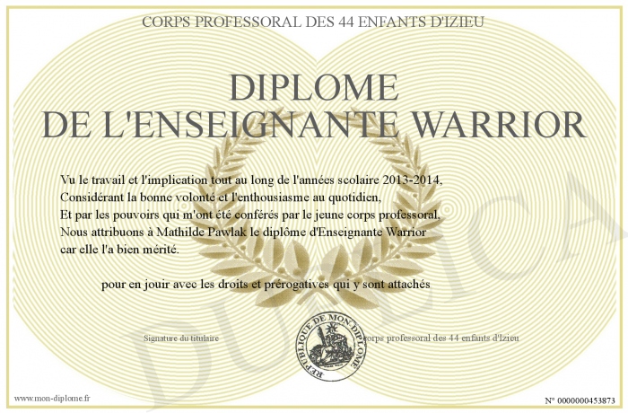 Envoyez par email votre Diplôme de l'Enseignante Warrior personalisé
