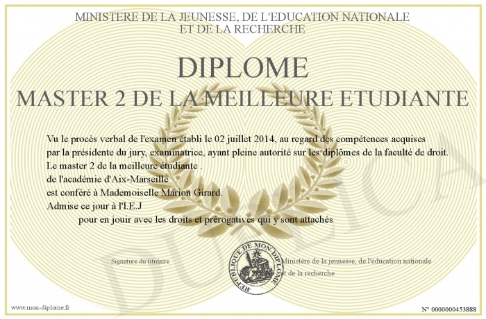 Envoyez par email votre Diplôme master 2 de la meilleure étudiante personalisé
