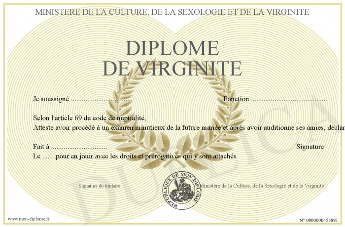 Envoyez par email votre Diplôme de Virginité personalisé