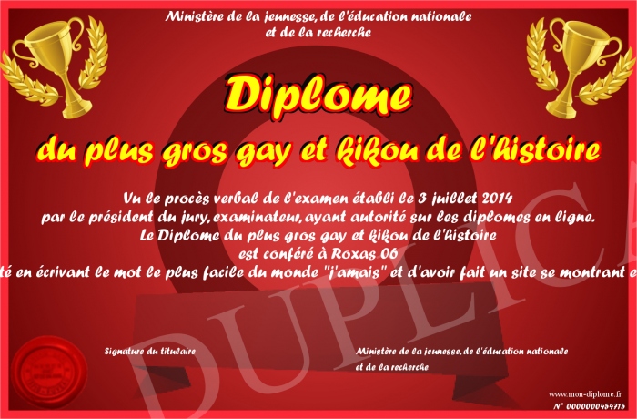 Envoyez par email votre Diplôme du plus gros gay et kikou de l'histoire personalisé