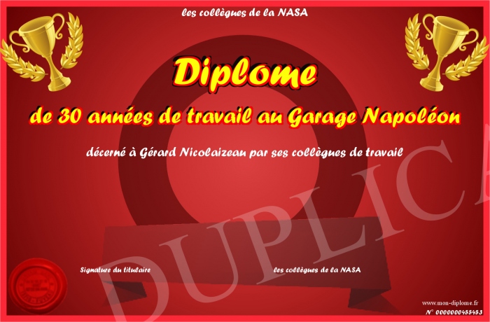 Envoyez par email votre Diplôme de 30 années de travail au Garage Napoléon personalisé