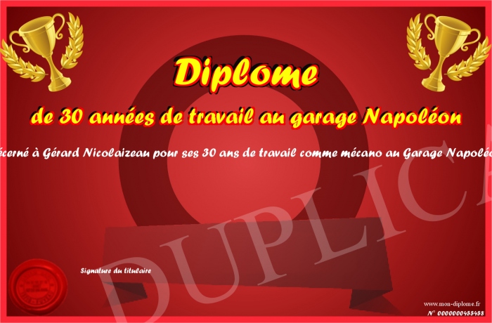 Envoyez par email votre Diplôme de 30 années de travail au garage Napoléon personalisé