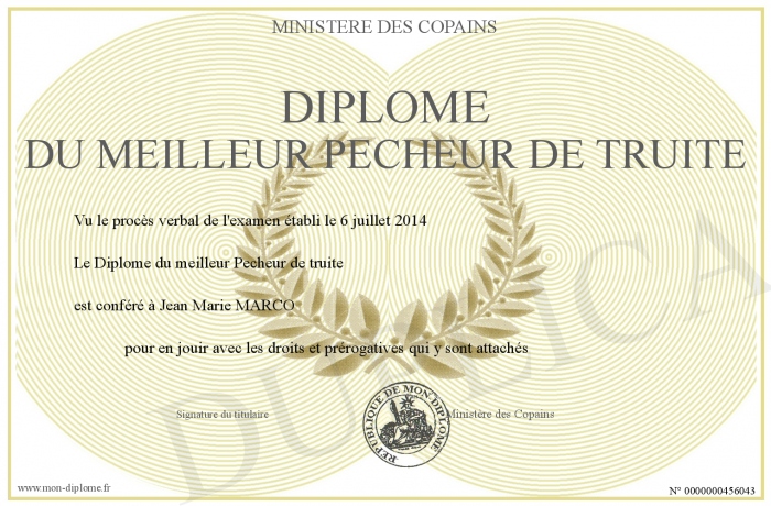 Envoyez par email votre Diplôme du meilleur Pecheur de truite personalisé