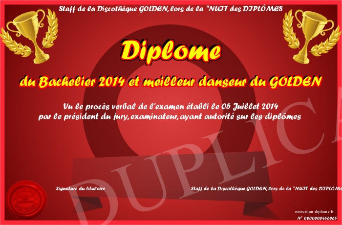 Envoyez par email votre Diplôme du Bachelier 2014 et meilleur danseur du GOLDEN personalisé