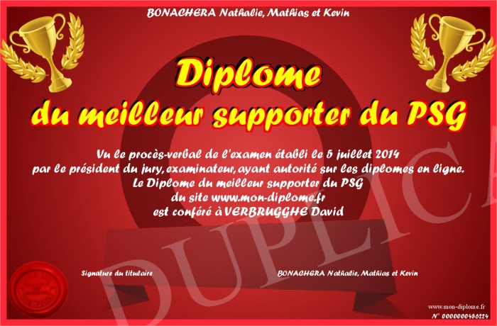 Envoyez par email votre Diplôme du meilleur supporter du PSG personalisé