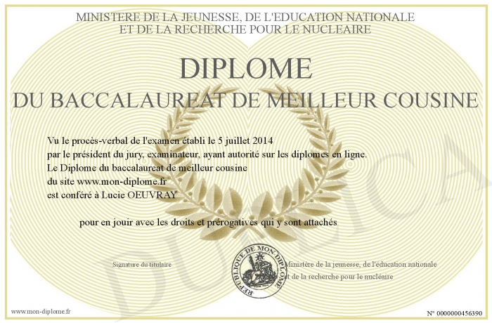 Envoyez par email votre Diplôme du baccalaureat de meilleur cousine personalisé