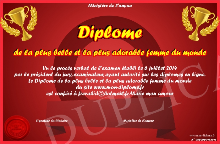 Envoyez par email votre Diplôme de la plus belle et la plus adorable femme du monde personalisé