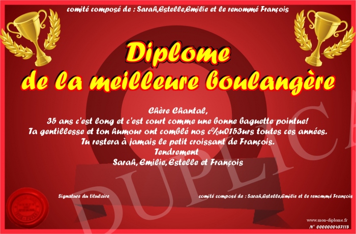 Envoyez par email votre Diplôme de la meilleure boulangère personalisé