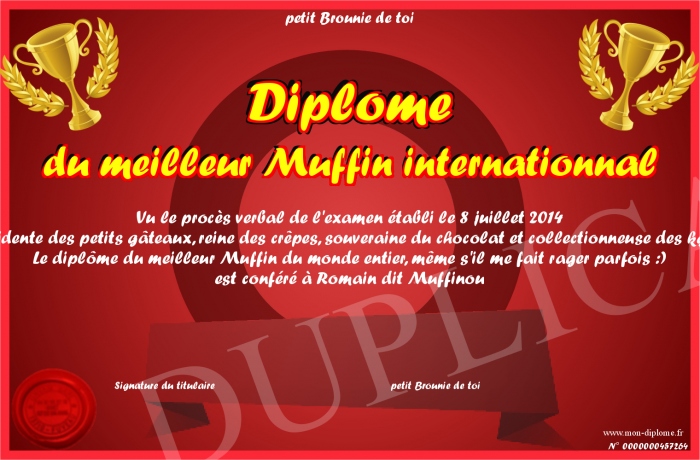 Envoyez par email votre Diplôme du meilleur Muffin internationnal personalisé