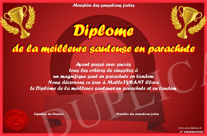 Envoyez par email votre Diplôme de la meilleure sauteuse en parachute personalisé