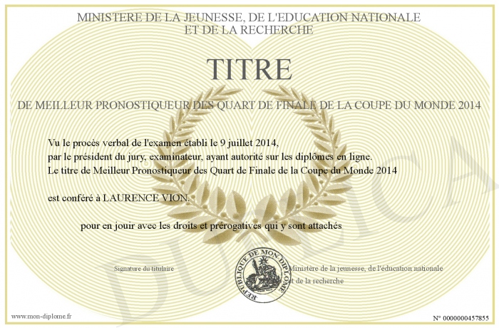 Envoyez par email votre titre de Meilleur Pronostiqueur des Quart de Finale de la Coupe du Monde 2014 personalisé
