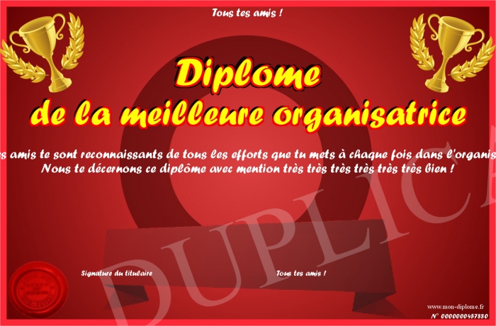 Envoyez par email votre Diplôme de la meilleure organisatrice personalisé