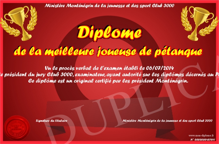 Envoyez par email votre Diplôme de la meilleure joueuse de pétanque personalisé