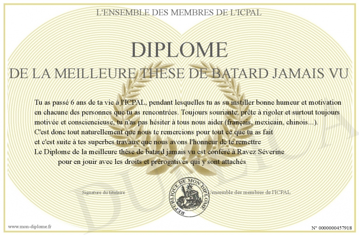 Envoyez par email votre Diplôme de la meilleure thèse de batard jamais vu personalisé
